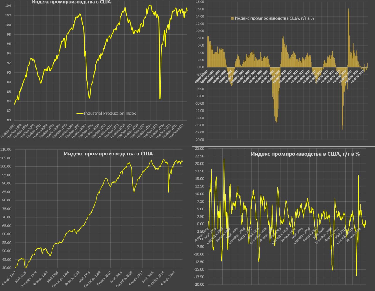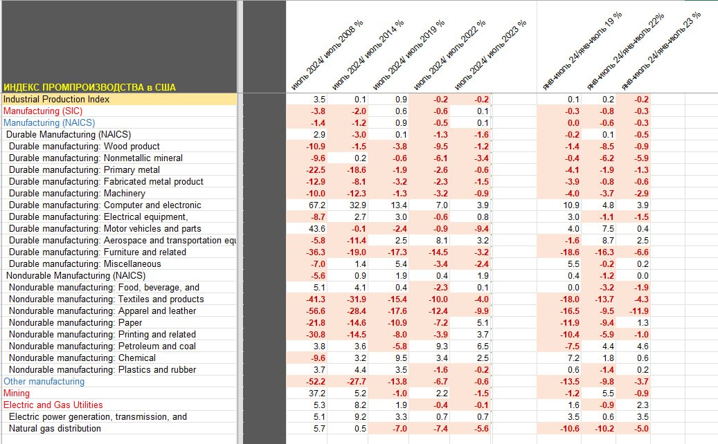 Промышленное производство США в июле снизилось на 0.64% м/м, а июньские данные пересмотрели в худшую сторону на 0.43%, т.е. минус процент от июньской базы, это слабые данные, нивелирующие весь прогресс, достигнутый весной 2024.
