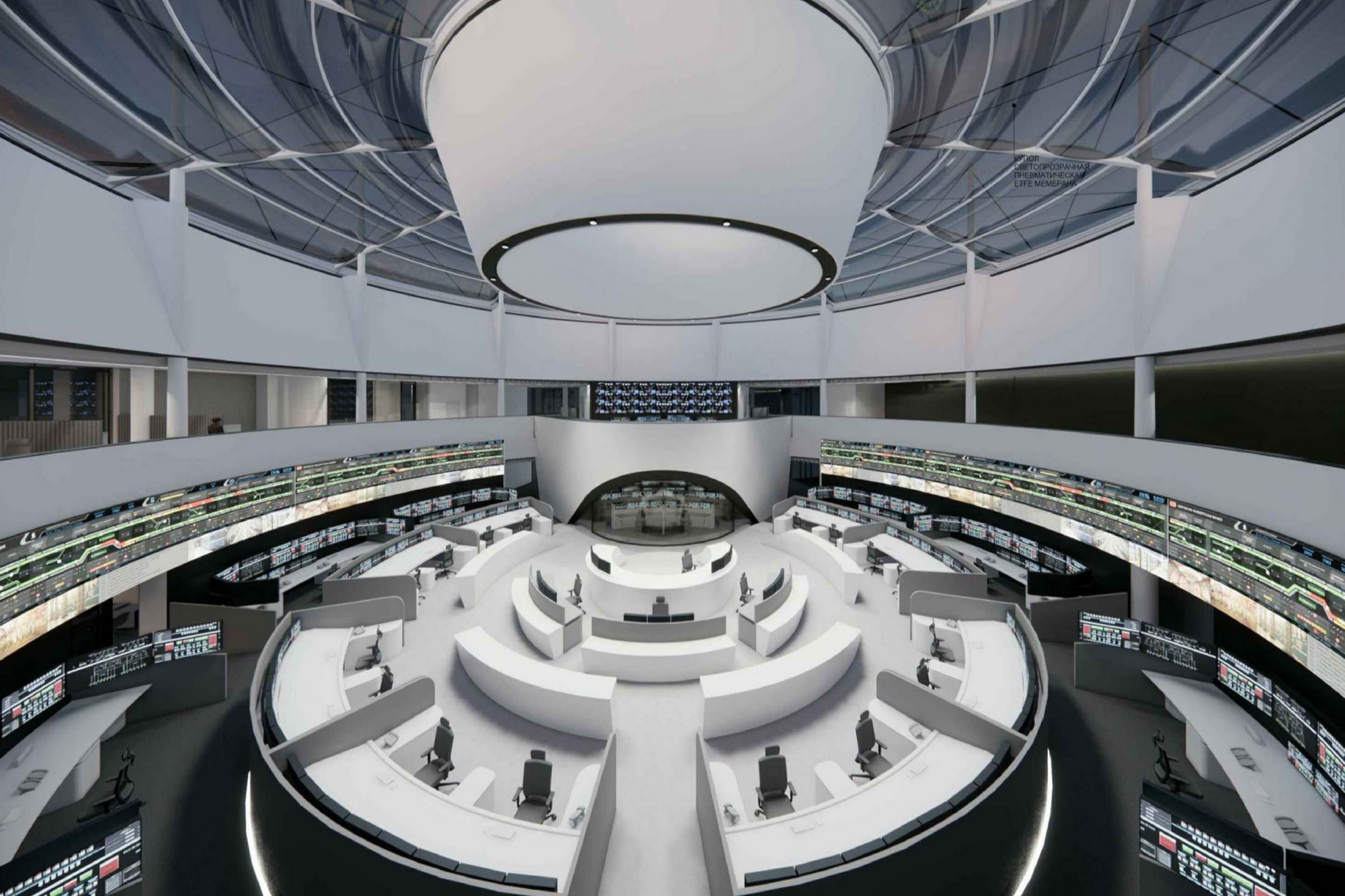 Отдельно рассказано об интерьерах этого диспетчерского центра, который займет верхние этажи здания. Вот так будут выглядеть диспетчерский зал, ситуационный центр, вестибюль ЕДЦМ, коридоры, кафе.