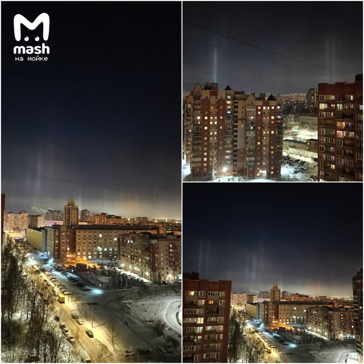 Световые столбы в районе метро "Гражданский проспект" прямо сейчас — подписчики делятся кадрами редкого природного явления. Оно появляется исключительно в сильно минусовую погоду и в тёмное время суток.