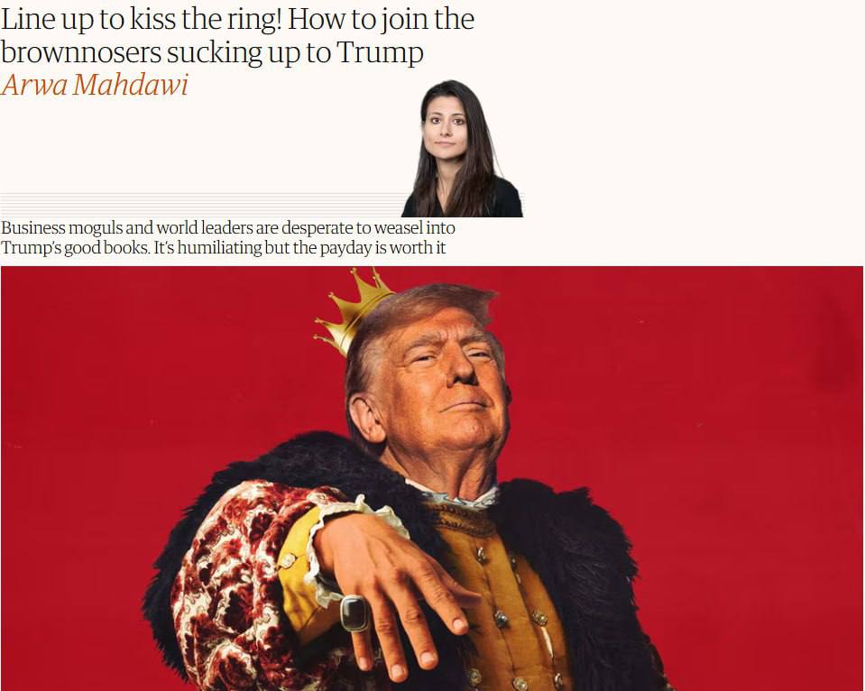 ΠΠΎΠ»ΠΎΠ½ΠΊΡ ΠΏΠΎΠ΄ ΡΠ°ΠΊΠΈΠΌ Π·Π°Π³ΠΎΠ»ΠΎΠ²ΠΊΠΎΠΌ ΠΎΠΏΡΠ±Π»ΠΈΠΊΠΎΠ²Π°Π»Π° ΠΎΠ±ΠΎΠ·ΡΠ΅Π²Π°ΡΠ΅Π»Ρ The Guardian ΠΡΠ²Π° ΠΠ°Ρ Π΄Π°Π²ΠΈ, ΠΊΠΎΠΌΠΌΠ΅Π½ΡΠΈΡΡΡ, ΠΊΠ°ΠΊ ΠΏΠΎΠ»ΠΈΡΠΈΠΊΠΈ ΠΈ Π±ΠΈΠ·Π½Π΅ΡΠΌΠ΅Π½Ρ ΡΠ΅Π·ΠΊΠΎ Π·Π°Π±ΡΠ»ΠΈ ΡΠ²ΠΎΠΈ ΠΎΠ±Π²ΠΈΠ½Π΅Π½ΠΈΡ Π² Π°Π΄ΡΠ΅Ρ Π’ΡΠ°ΠΌΠΏΠ° ΠΈ ΡΠ΅ΠΏΠ΅ΡΡ ΡΠΏΠ΅ΡΠ°Ρ ΠΊ Π½Π΅ΠΌΡ Β«Π½Π° ΠΏΠΎΠΊΠ»ΠΎΠ½Β».