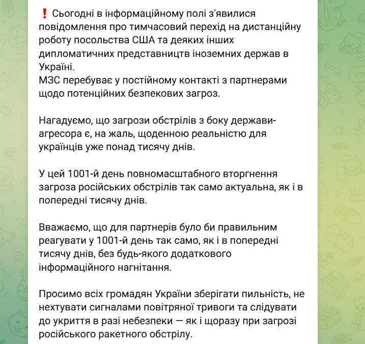«В этот 1001-й день полномасштабного вторжения угроза российских обстрелов так же актуальна, как и в предыдущие тысячу дней. <...> Просим всех граждан Украины сохранять бдительность, не пренебрегать сигналами воздушной тревоги и следовать в укрытие в случае опасности — как и каждый раз при угрозе российского ракетного обстрела».