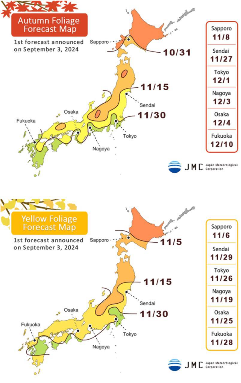 Даты «цветения» листьев можно изучить на сайте Японского метеорологического агентства: https://n-kishou.com/corp/news-contents/autumn/?lang=en