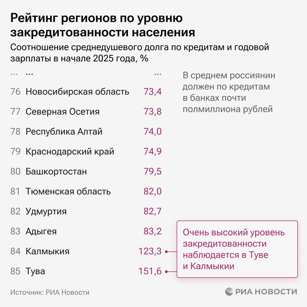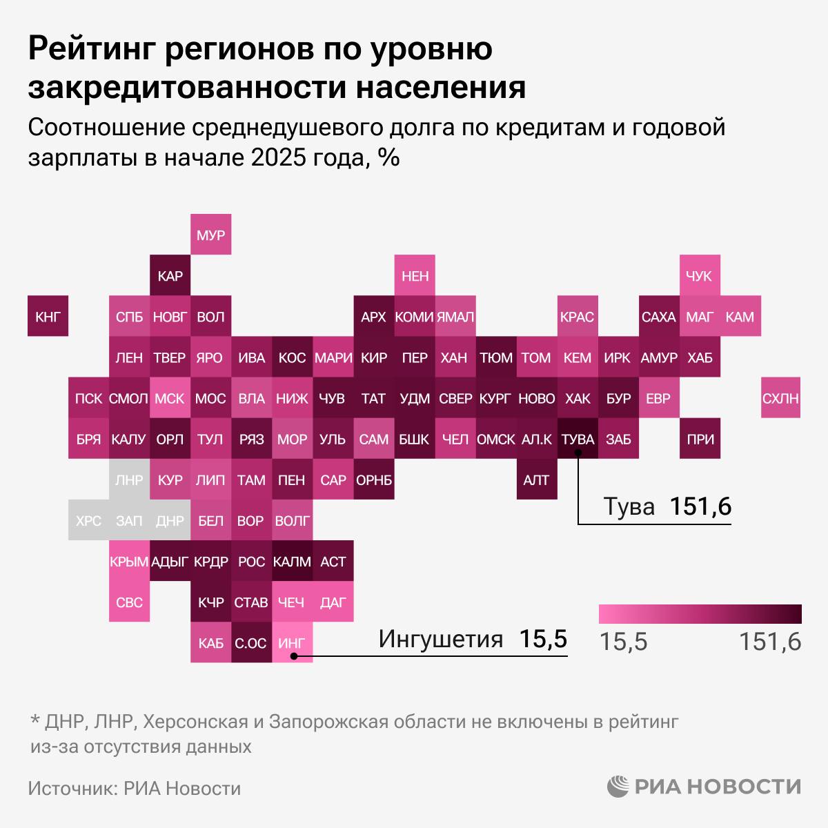 Ингушетия, Крым и Дагестан - наименее закредитованные регионы России, свидетельствуют результаты рейтинга РИА Новости. Очень высокая долговая нагрузка перед банками - у жителей Тувы и Калмыкии.