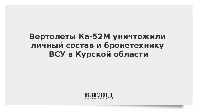 Экипажи вертолетов Ка-52М нанесли удар по живой силе и бронетехнике ВСУ в Курской области, сообщило Министерство обороны России.