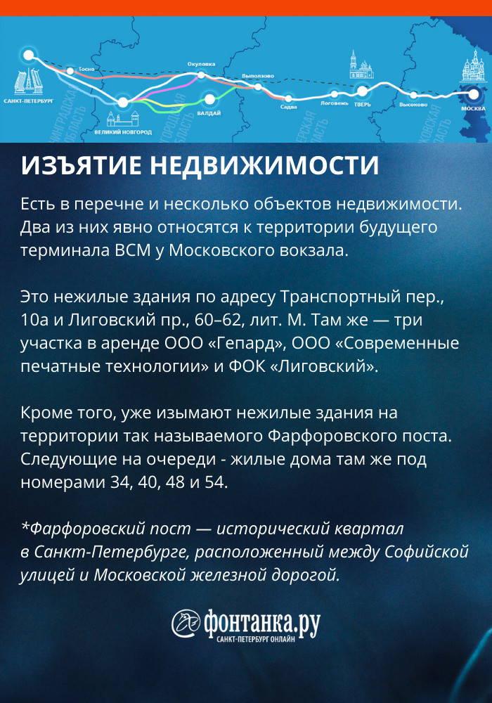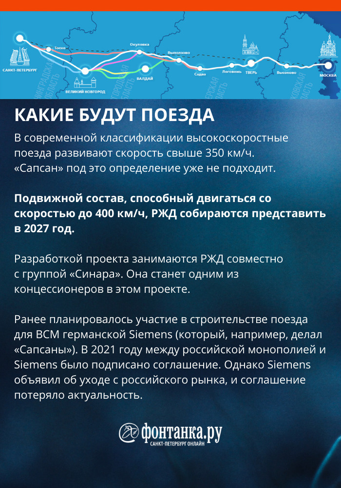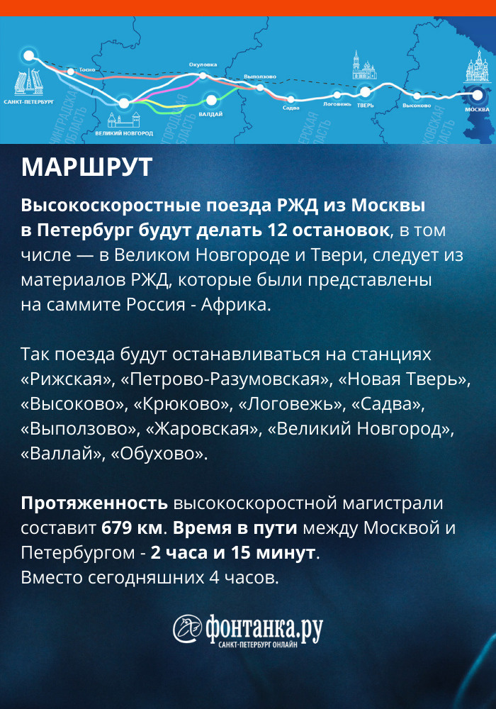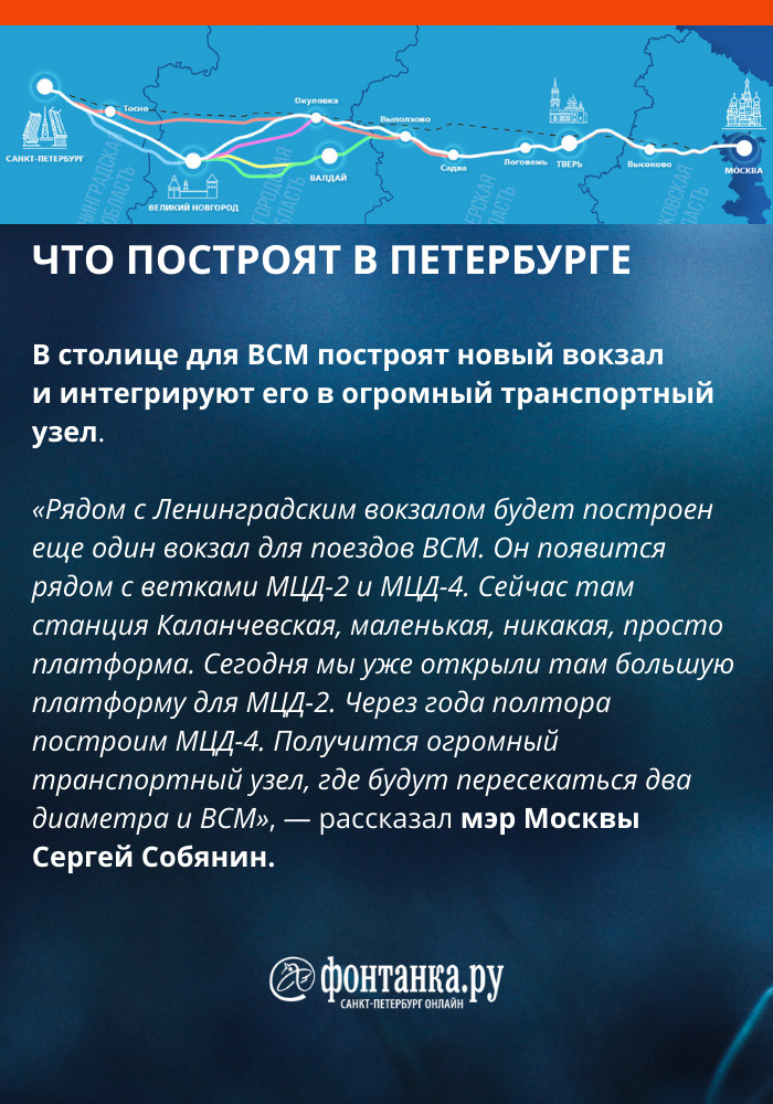 Новая ж/д-магистраль сократит время пути между столицами с 4 часов 5 минут до 2 часов 15 минут. А до Великого Новгорода из Петербурга можно будет доехать за 29 минут. Ранее уже сообщалось, что стоимость проекта оценивается в 1,7 трлн рублей, а для его реализации и в Москве, и в Петербурге будут изымать земельные участки и переселять из жилых домов. Рассказываем, что известно о проекте ВСМ на данный момент.