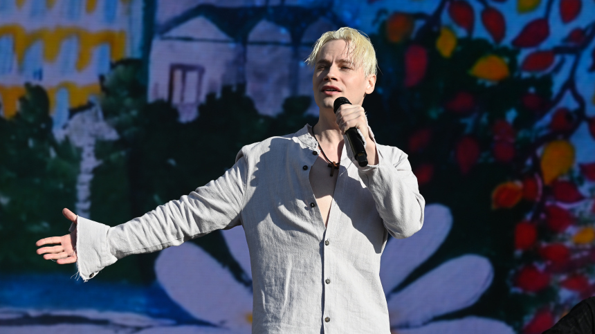Сценография выстроена таким образом, что фигура SHAMAN в белом костюме (даже стойка микрофона белая — Прим. ред.) выглядит сияющей звездой во Вселенной.