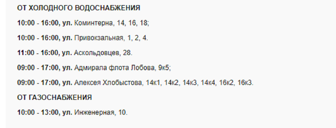 Кроме того, холодное водоснабжение и газоснабжение будет отсутствовать сегодня, 16 июля, по следующим адресам: