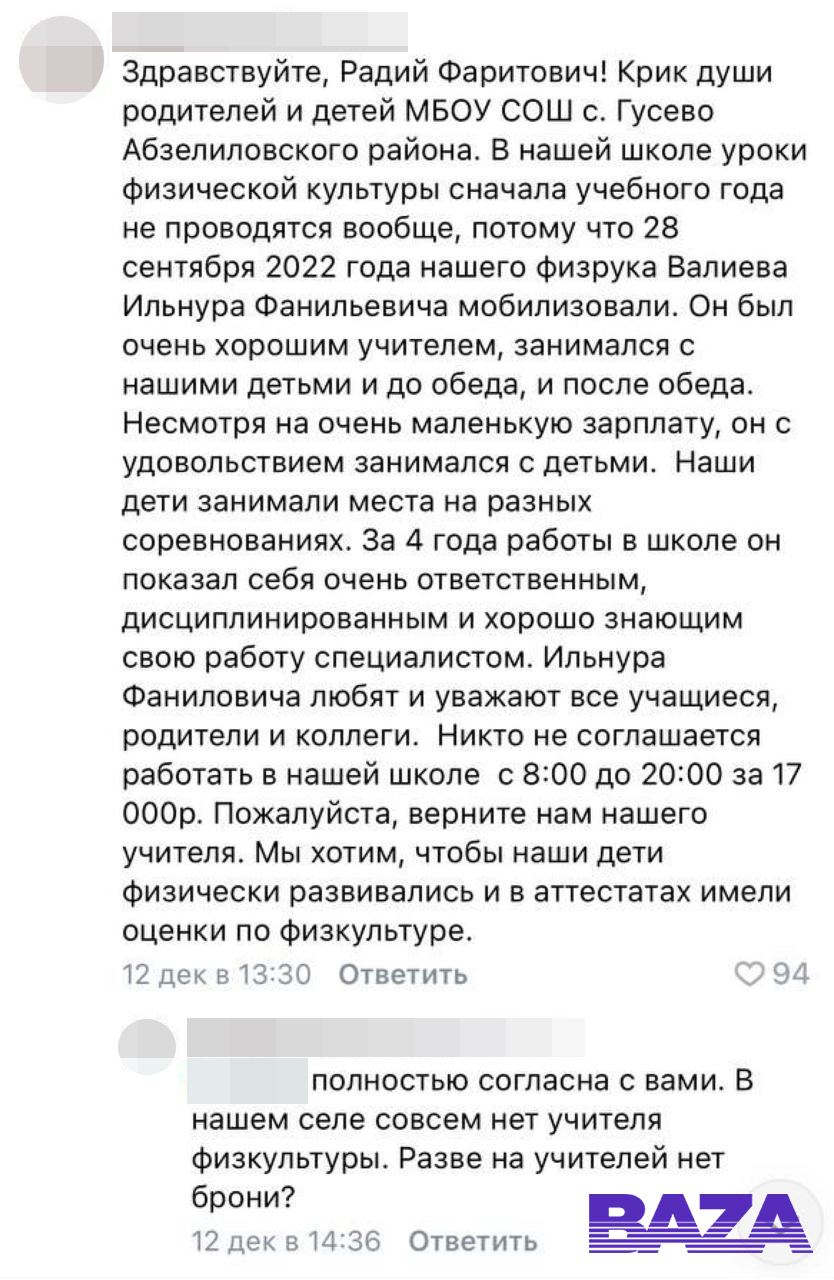 Тем не менее жители села вместе с учителями написали коллективное письмо главе Башкирии Радию Хабирову с просьбой вернуть Валиева в школу. Дети, их родители и сотрудники учреждения тепло отзывается об учителе физкультуры: при нём дети часто становились призёрами соревнований.