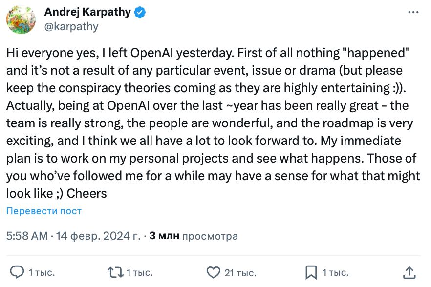 Андрей Карпаты ушел из OpenAI. Он уточнил, что никакой драмы не произошло. Скорее всего, он не вернется в компанию через пару дней, как это было с Сэмом Альтманом.