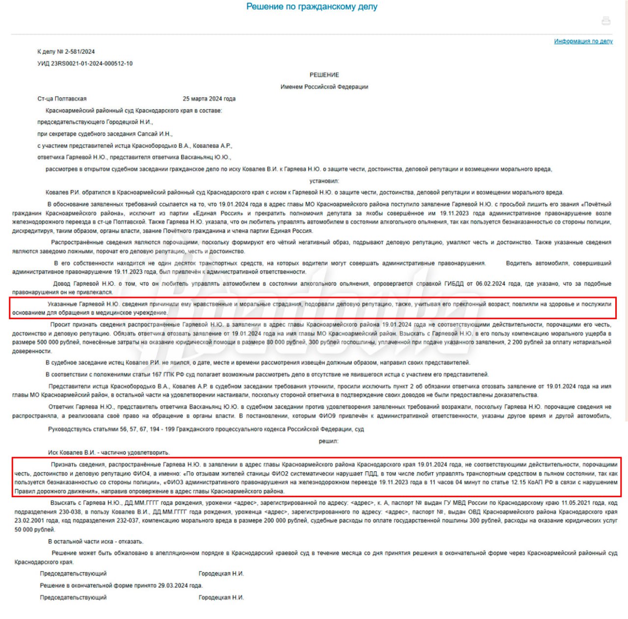 В разговоре с Readovka Наталья заявила, что позже, когда обе машины выехали с переезда, она увидела того самого Романа Ковалева. Однако сам депутат говорит, что за рулем был его водитель. После публикации видео активисткой мужчина, который, по словам Ковалева, и управлял авто, получил штраф в ₽5 тыс, а Наталье прилетел иск о защите чести и достоинства. Из материалов дела следует, что она «причинила депутату нравственные и моральные страдания», которые «послужили основанием для обращения в медицинское учреждение».
