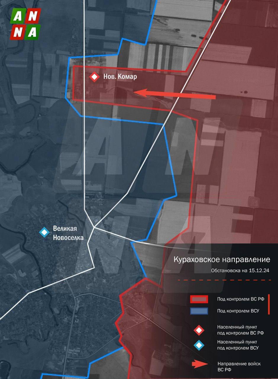 Еще южнее ВС РФ продвинулись до поселка Новый Комар, противник пытается контратаковать, но его накаты отбивают.