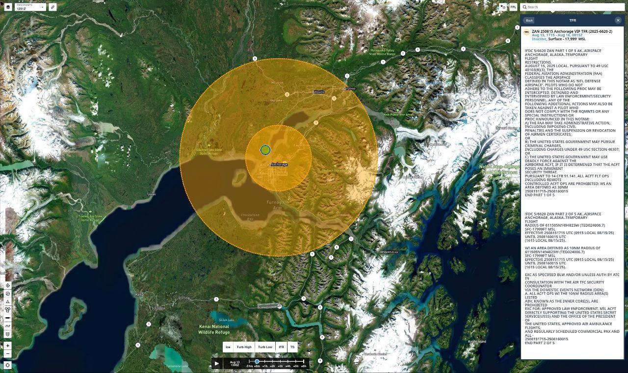 Зона запрета доступа над Анкориджем (Аляска) на время проведения саммита Путин - Трамп с 15 по 16 августа.
