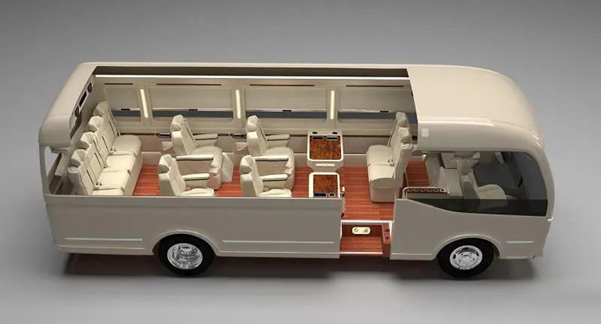 Известно, что длина салона автобуса Guoyue REEV составляет 5443 мм, ширина – 1900 мм, высота – 1900 мм. Автобус предлагается в двух конфигурациях, в нём могут быть места либо для 17, либо для 19 седоков. В целом габариты коммерческой модели – 7295 х 2090 х 2785 мм, а колёсная база равна 3990 мм.