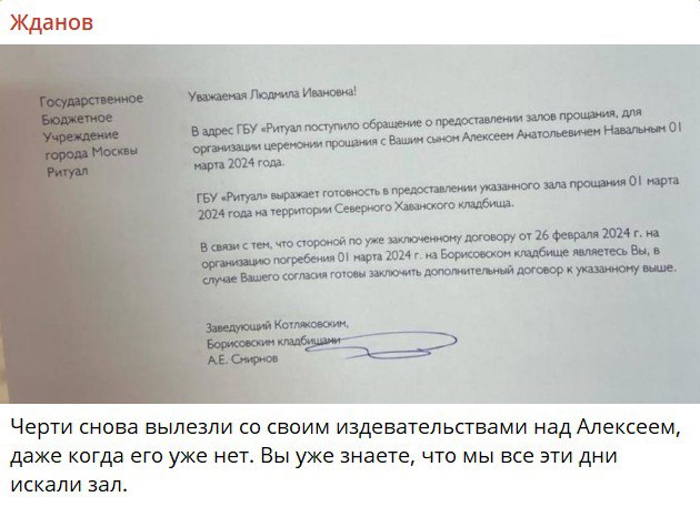 Родителям Навального предлагали этот зал (второе фото), но верхушка ФБК во главе с Иоландой запротестовала. Им нужна провокация в Москве в условленную дату. Поэтому амбассадор геля для волос Жданов сейчас и вбрасывает подобные фейки. Поэтому беглые марзи-экстремисты вопреки воле родителей Алексея и наперекор христианским традициям решили оттянуть похороны. И без указаний западных хозяев ФБК, конечно, же не обошлось.