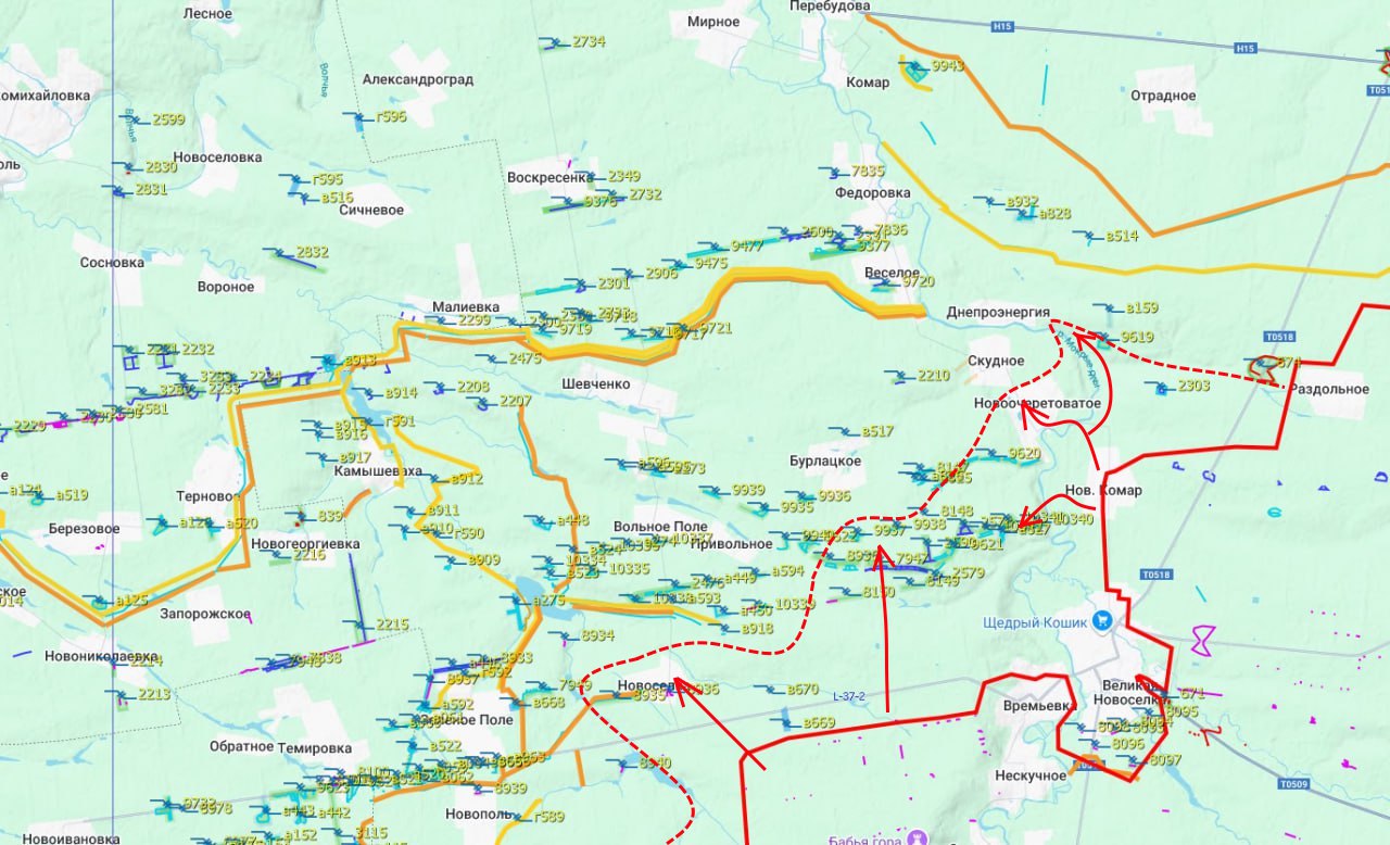 А еще пытаются зайти в Днепроэнергию. Таким образом, если мы посмотрим на карту где нанесены укрепления противника, мы видим, что наше командование пытается использовать слабое место мощных в целом оборонительных линий противника и тот факт, что они строились до появления на поле боя дронов (тем более на оптоволокне). Что во многом их тоже ослабляет.