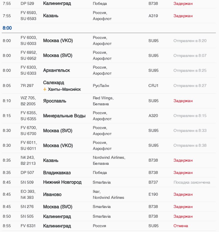 В Пулково ранее сообщили, что аэропорт работает штатно, но время обслуживания бортов может быть незначительно увеличено из-за противооблединительной обработки. Задержки не связаны с погодой, в большинстве случаев причина — позднее прибытие самолётов.