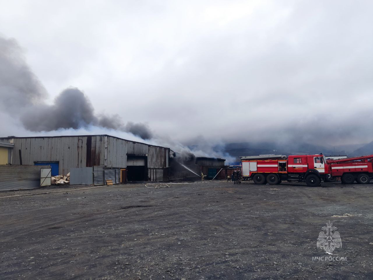 В Норильске горит склад с пиломатериалами. Предварительная площадь пожара составляет 1200 квадратных метров.