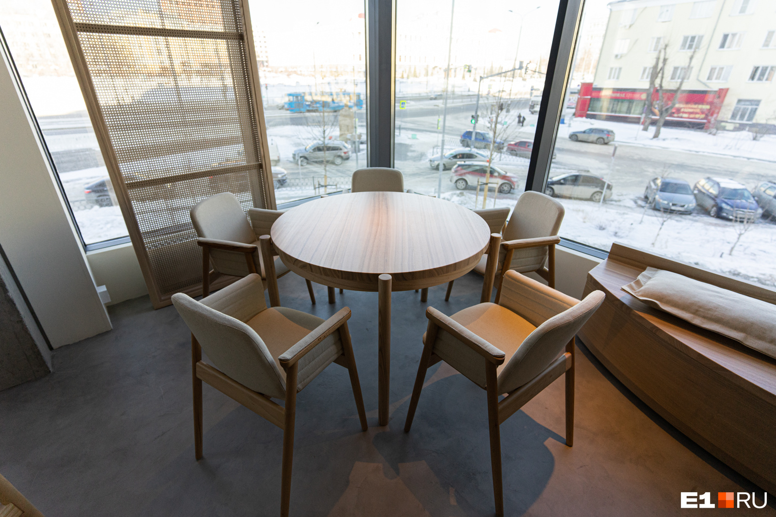 В дизайне попытались сделать отсылки к русской избе: в углу появилась декоративная печь, под потолком — резные наличники, а в центре одного из залов — длинный стол для застолий.