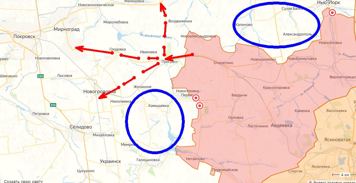 Более того: опираясь на Прогресс, наши войска могут не идти в сторону Покровска, а нанести удар на юг, в сторону трассы Е-50, создав угрозу Селидово; или же повернуть наступление на север, с целью перерезать трассу Т-0504. В первом случае под ударом оказываются тылы бывшей авдеевской группировки, занимающей позиции на широком пространстве от Новоселки Первой до Красногоровки. При повороте на север дискомфорт в тыльной части ощутят силы ВСУ, ведущие бои за Нью-Йорк.