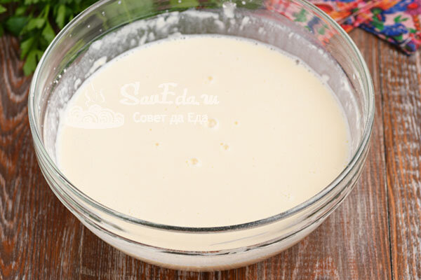 1. Для блинчиков в миске взбиваем венчиком одно яйцо, сахар и соль (1/2 ч. л.). Вливаем половину теплого молока, добавляем соду, всю муку и замешиваем густоватое тесто. Затем вливаем масло (2 ст. л.), остатки молока, перемешиваем и получаем жидкое тесто. Накрываем и оставляем на столе.