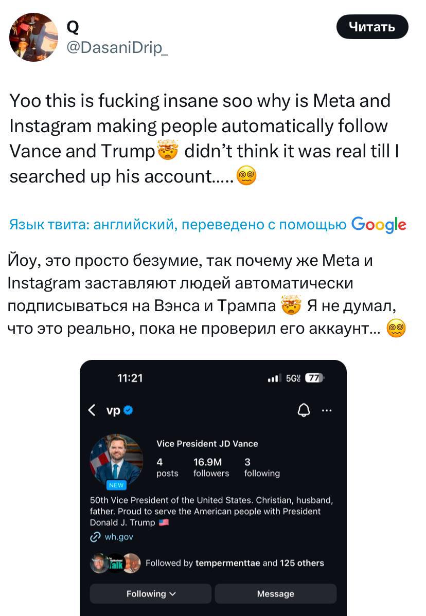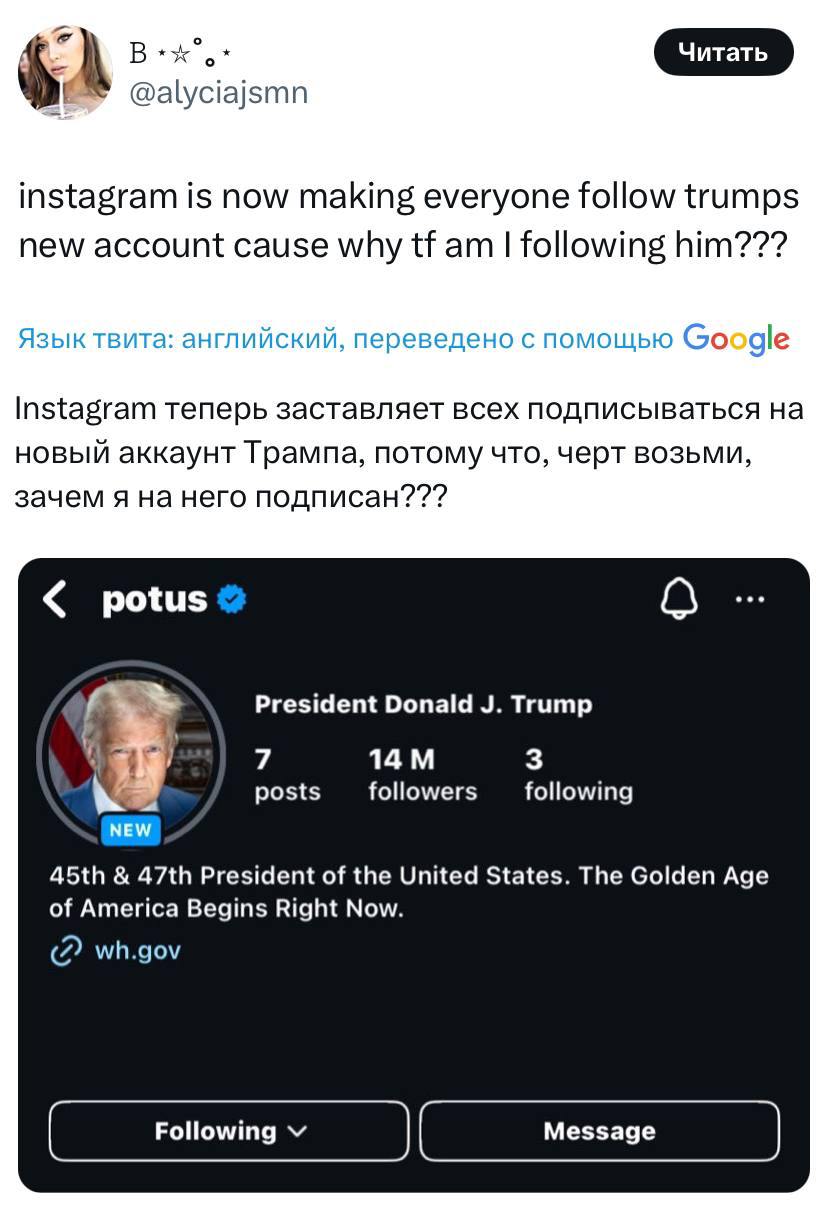 Instagram* автоматически подписывает пользователей на аккаунты Трампа, его жены Меланьи и вице-президента Вэнса.