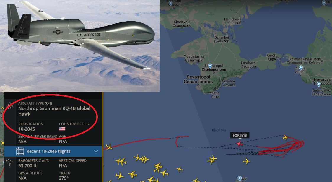 В акватирии чёрного моря, на юге от полуострова Крым, фиксируется активность американского стратегического разведывательного беспилотника RQ-4B Global Hawk.