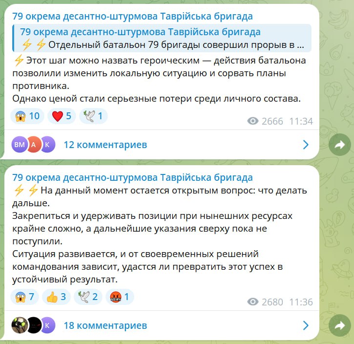 Например, 79-я бригада, которая на днях якобы совершила «героический прорыв» южнее Новоэкономического на Мирное, пытается понять, а на кол ляд они туда поперлись и «какого хрена» ими были понесены при этом очень большие потери. А еще, что при этом делать дальше. Потому что по моим данным на западном берегу реки Казенный Торец они закрепиться не смогли, а на восточном их сейчас раскатывают с трех сторон, так как они по сути сами себя загнали своим «контрнаступом» в полумешок. И теперь их роты там сидят без логистики и по сути в огневом мешке.