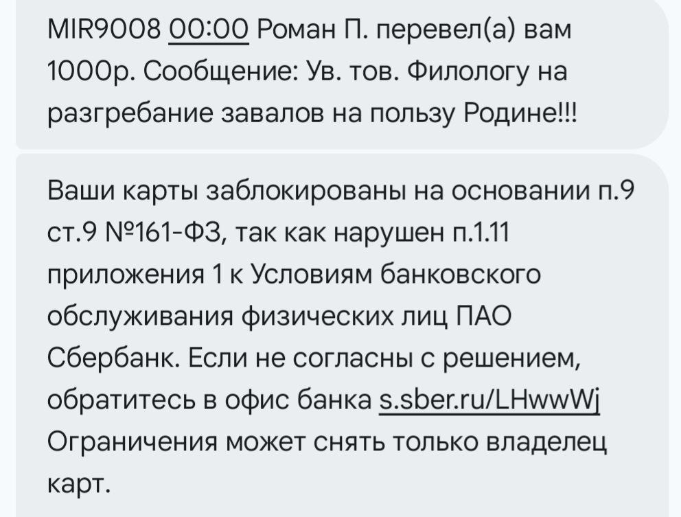 Наш горячо ценимый Сбер заблокировал карту)) Причём так совпало, что заблокировал после поступления со следующей подписью: "Ув. тов. Филологу на разгребание завалов на пользу Родине!!!" Изумительно знаковое совпадение)) В общем, завтра пойду восстанавливать. Брошу, блять, вычитывание документа по методике применения штурмовых подразделений и пойду...