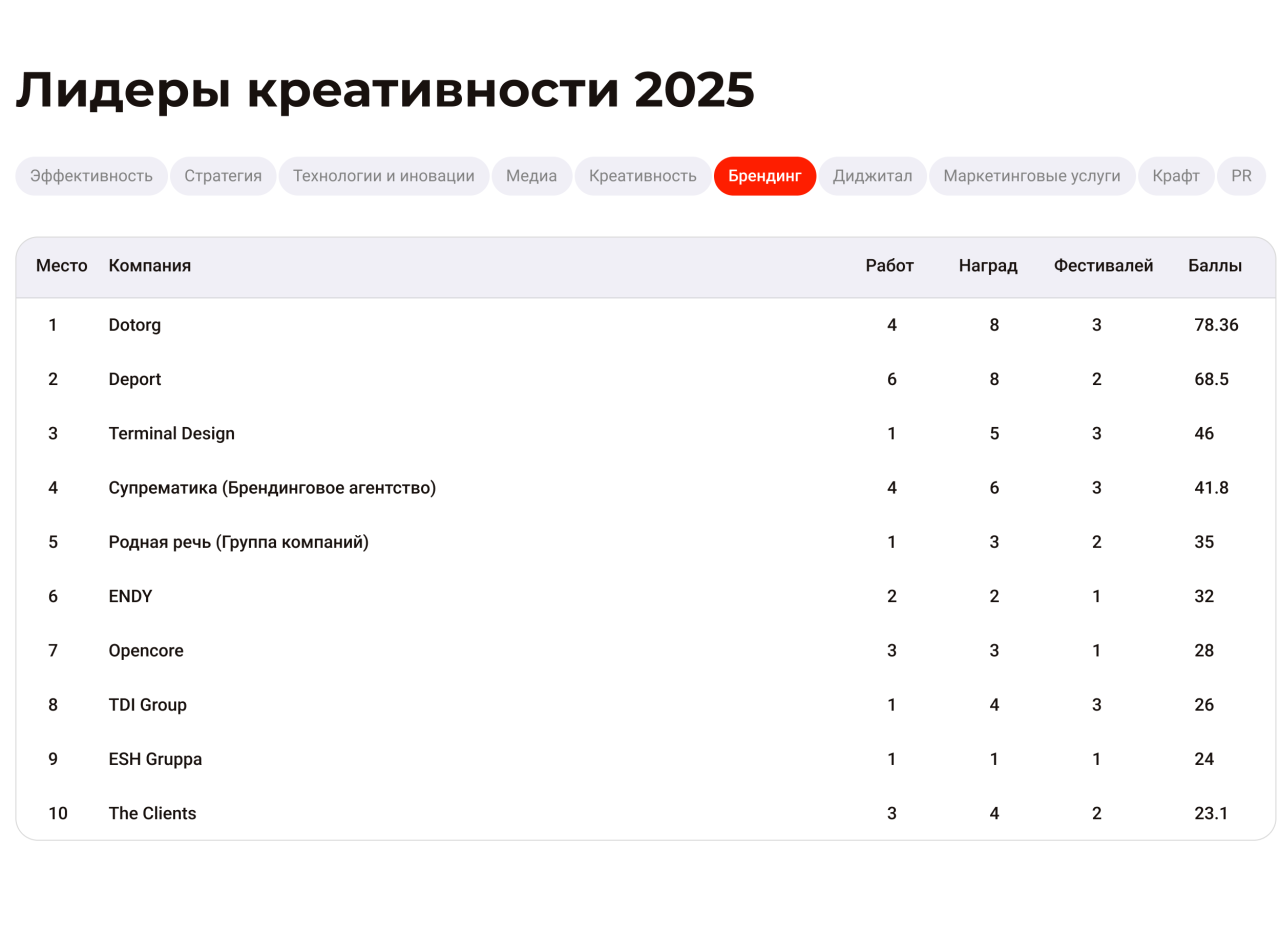Брендинговое агентство Dotorg стало лидером в категории «Брендинг» Национального рейтинга рекламных агентств Sostav по итогам семи фестивалей. Оно получило 78,36 балла — восемь наград за четыре работы на трех фестивалях.