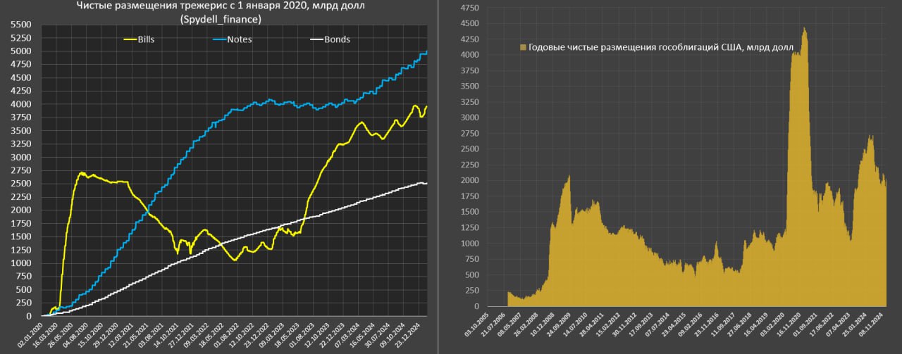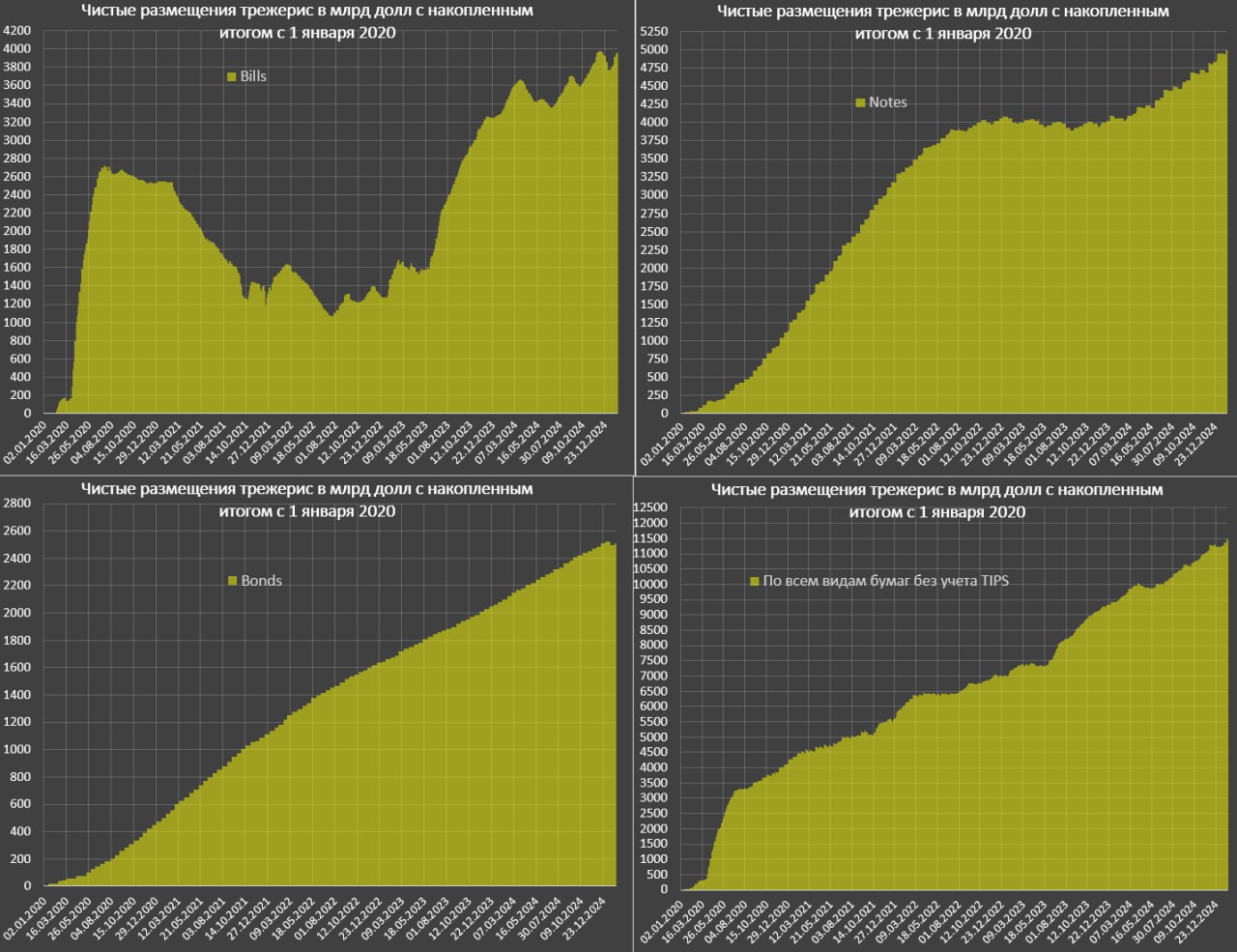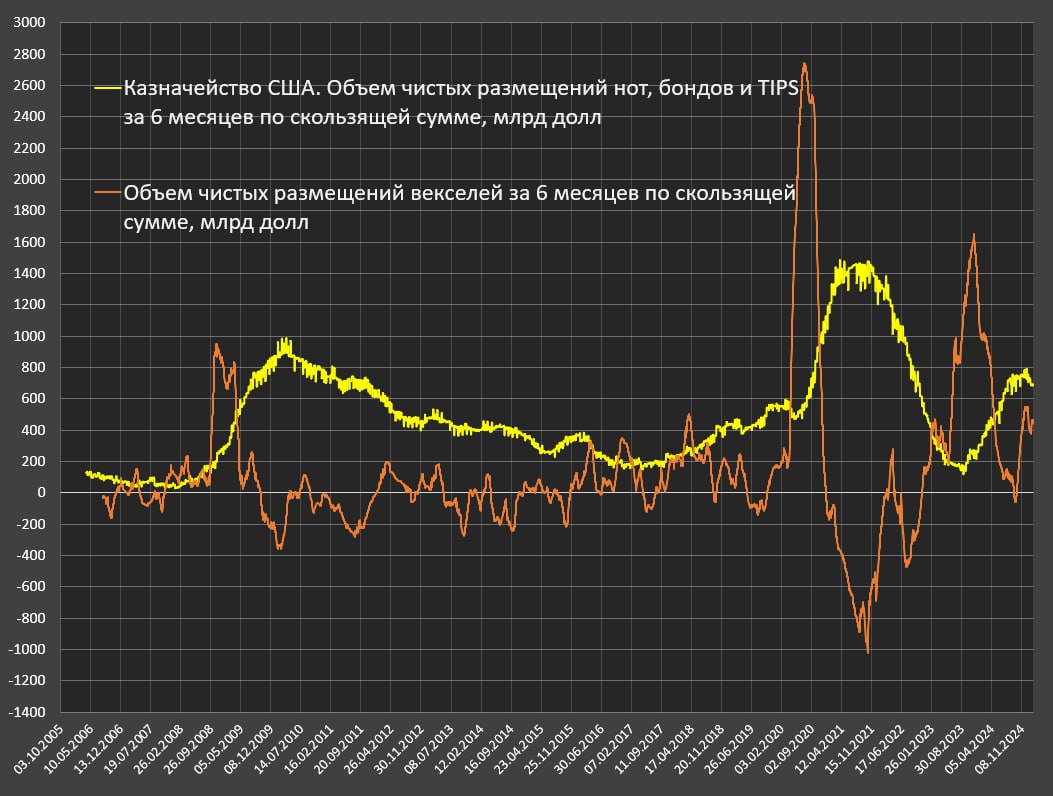 С начала 2025 фискального года (окт.24-янв.25) накопленные чистые размещения векселей составили 375 млрд, нот – 315.5 млрд, бондов – 93.3 млрд, TIPS – 6.5 млрд, а в совокупности 790 млрд, что вполне соответствует годовой потребности в 2.1-2.3 трлн.