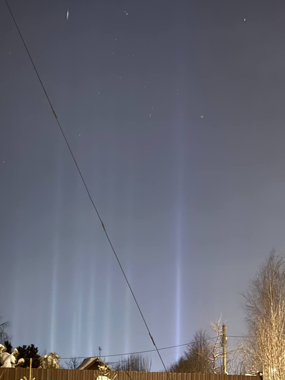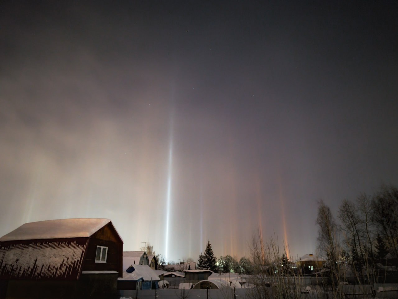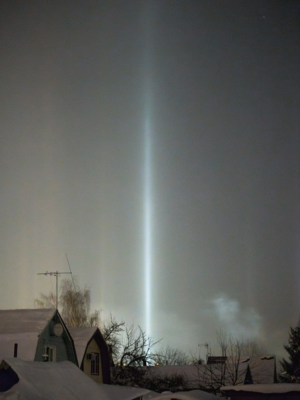 Сейчас в Московской области морозы, потому и стало возможным такое необычное погодное явление. Оно возникает, когда вода в воздухе замерзает, а свет от окон или фонарей отражается в кристаллах льда, формируя колонны.