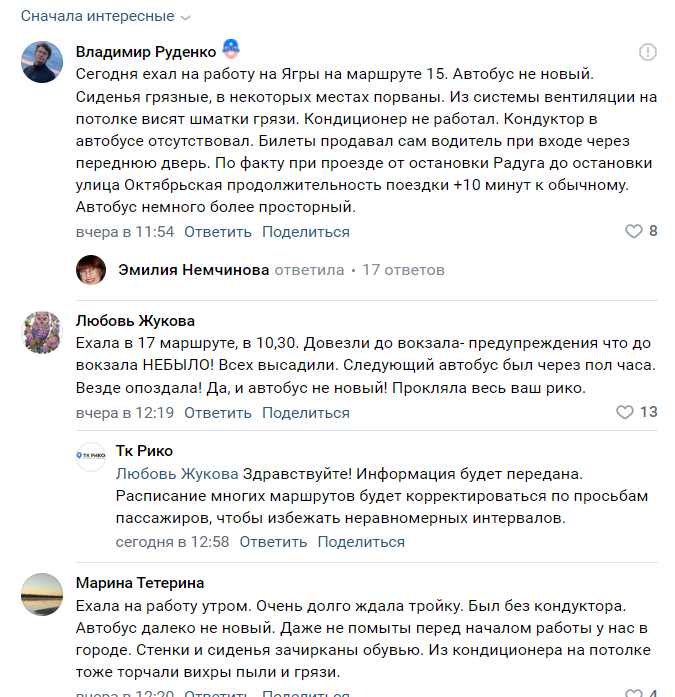 — Будет усилен контроль за чистотой в салонах автобусов. Кузовная мойка производится ежедневно, химчистка сидений на еженедельной основе. В ряде автобусов перед выпуском «прошли» службы эксплуатации, которые проверяли работы систем, размешали информационные стенды, поэтому в некоторых автобусах пассажиры заметили пыль. Расписание многих маршрутов будет корректироваться по просьбам пассажиров, чтобы избежать езды парами и неравномерных интервалов, — написали в «Рико».