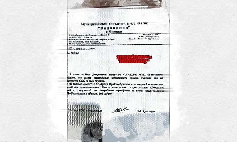Отметим: ранее жители Мценска уже обращались к Клычкову по поводу возможного сброса загрязнённой отходами производства нового завода по переработке картофеля воды в реку. Вызывала опасения у местных и опасная, на их взгляд, близость завода к местному пляжу, а главное — к недавно благоустроенному парку Шеншиных. Тогда в региональном Департаменте экономического развития пояснили, что ООО «Гранд Фрайз» действительно «предоставлено право использования водного объекта или его части с целью сброса сточных вод в соответствии с законодательством РФ. Однако компания спроектировала установку очистных сооружений с наилучшими технологиями очистки сточных вод».