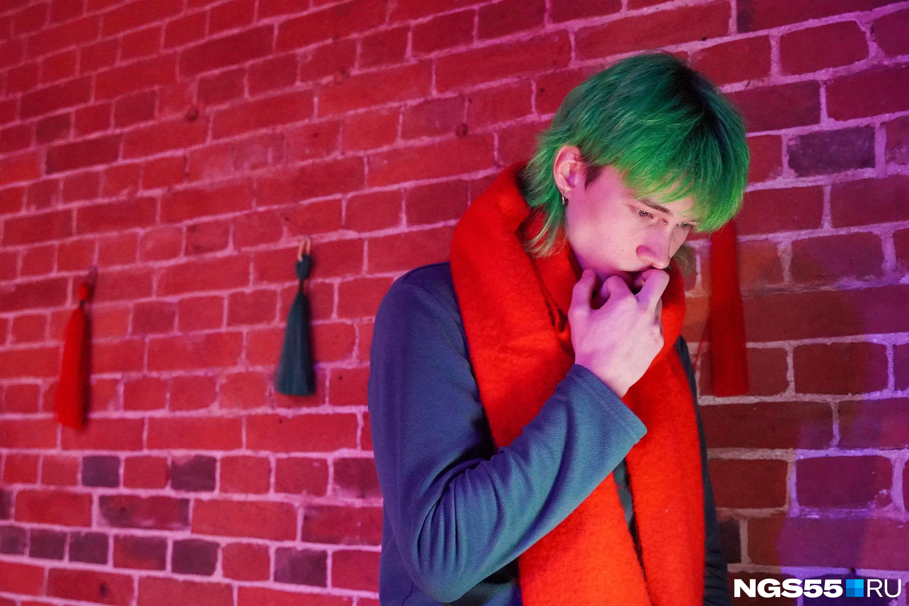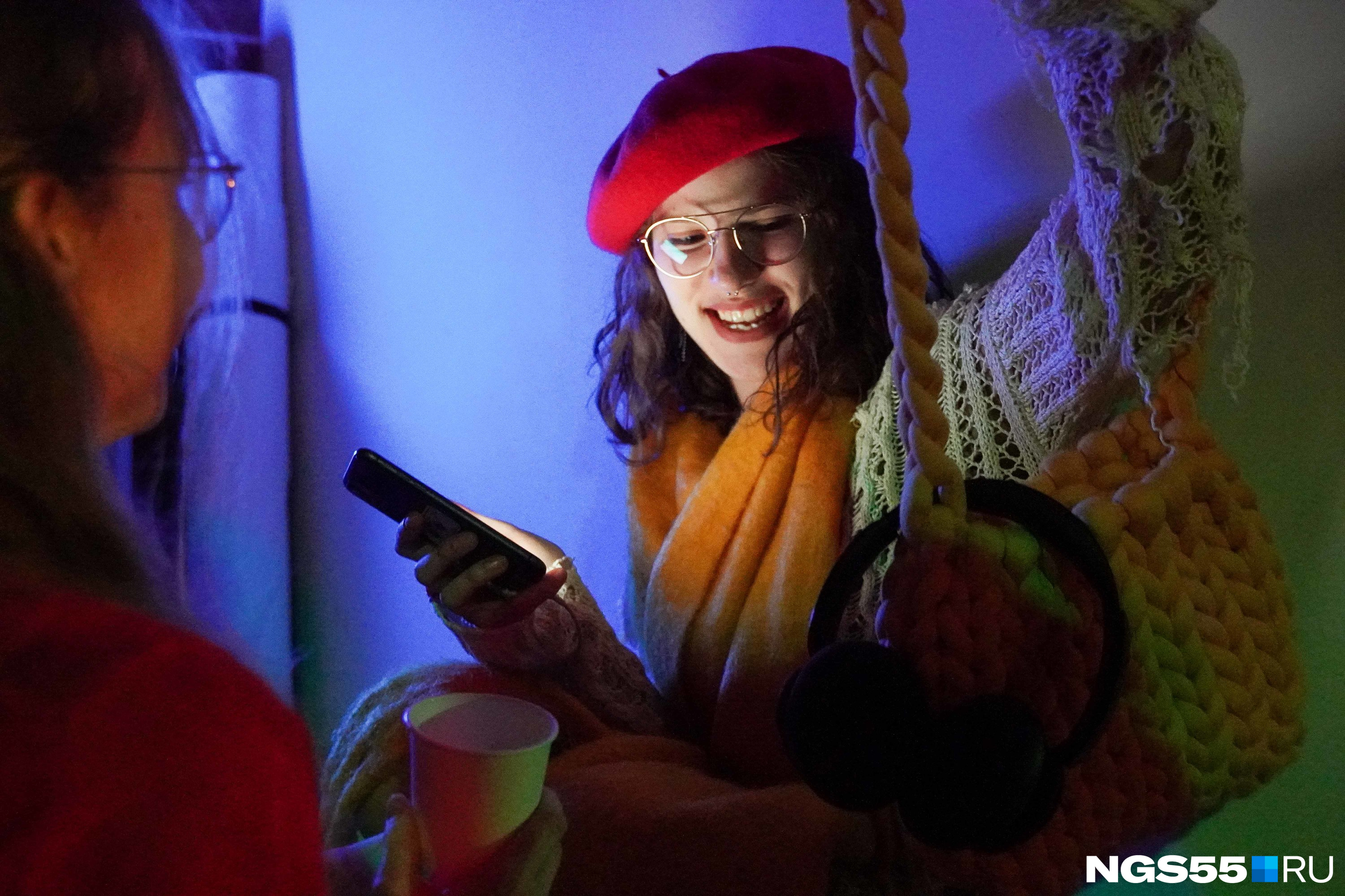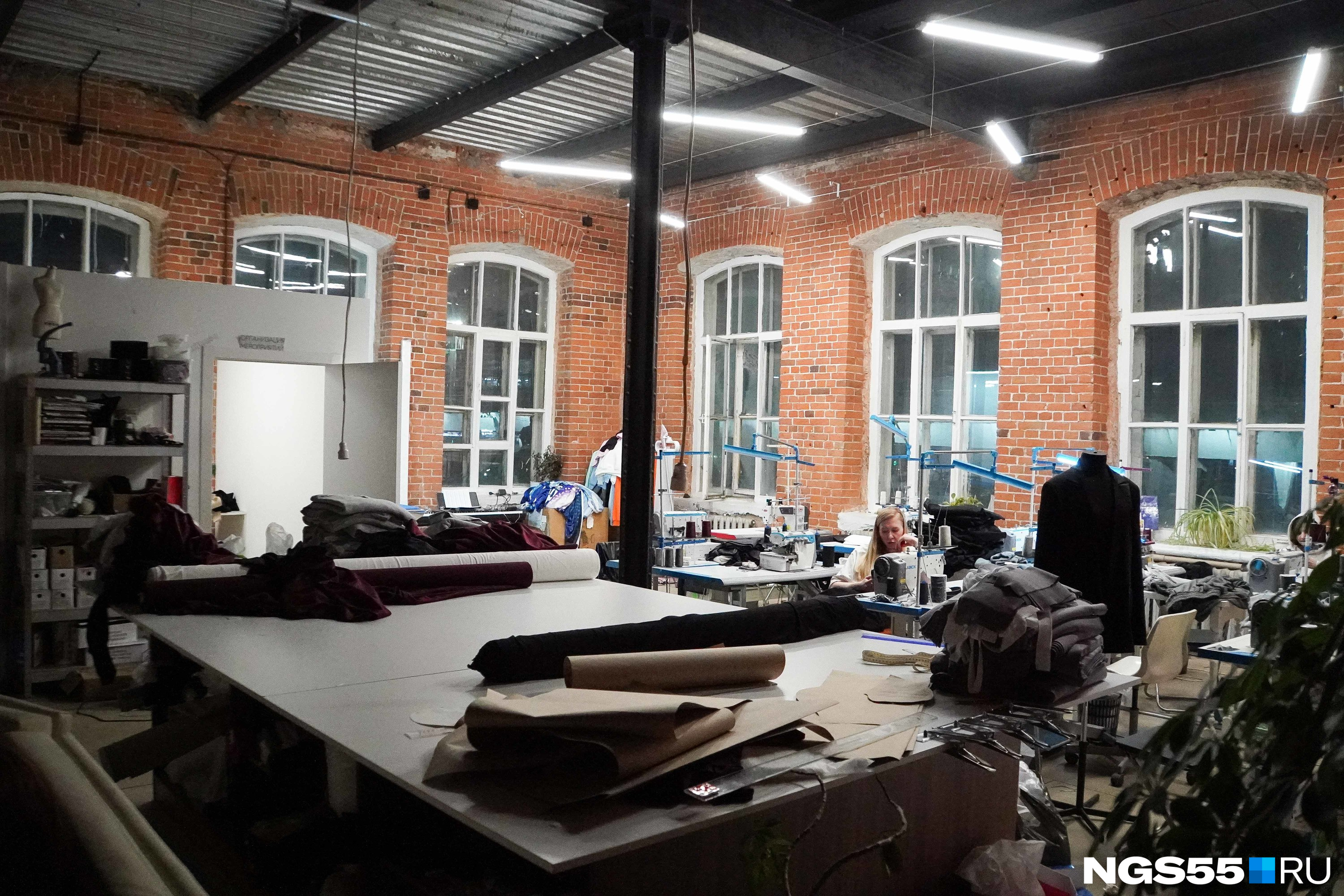 Я оказалась в тесной комнате, сплошь забитой куртками. В зоне по правую руку — куча ботинок тех, кто пьет китайский чай на ковре. Налево — неоновый танцпол. Рядом с ковром огорожено пространство с большими столами. Кажется, здесь шьют одежду. Возможно, потому что владелица пространства — старший преподаватель кафедры «Дизайн костюма» ОмГТУ Ольга Хмельницкая и здесь готовят одежду для показов омской арт-резиденции.