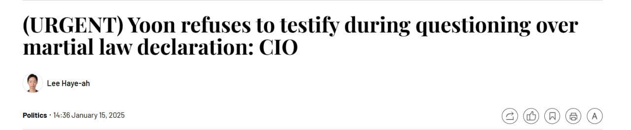 Арестованный президент Южной Кореи Юн Сок Ёль отказался давать показания по делу о