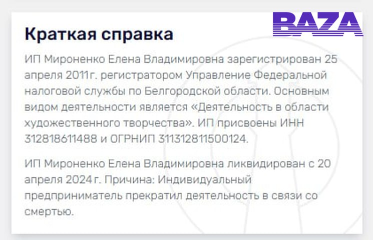 По данным «Базы», 24 января в России ликвидировали ИП Елены Мироненко. Причина — «индивидуальный предприниматель прекратил деятельность в связи со смертью».