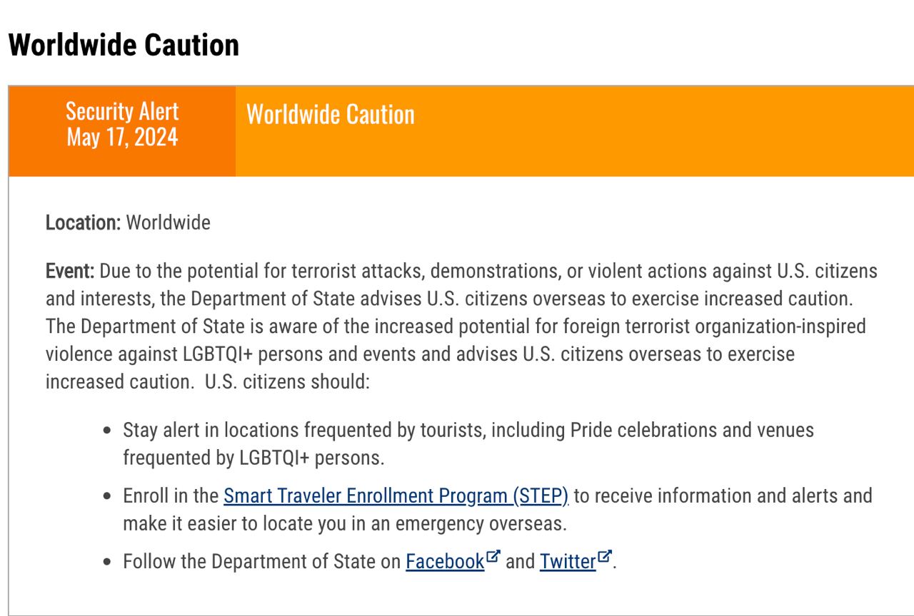 π Β«Π ΡΠ²ΡΠ·ΠΈ Ρ Π²ΠΎΠ·ΠΌΠΎΠΆΠ½ΠΎΡΡΡΡ ΡΠ΅ΡΡΠΎΡΠΈΡΡΠΈΡΠ΅ΡΠΊΠΈΡ Π°ΡΠ°ΠΊ, Π΄Π΅ΠΌΠΎΠ½ΡΡΡΠ°ΡΠΈΠΉ ΠΈΠ»ΠΈ Π½Π°ΡΠΈΠ»ΡΡΡΠ²Π΅Π½Π½ΡΡ Π΄Π΅ΠΉΡΡΠ²ΠΈΠΉ ΠΏΡΠΎΡΠΈΠ² Π³ΡΠ°ΠΆΠ΄Π°Π½ ΠΈ ΠΈΠ½ΡΠ΅ΡΠ΅ΡΠΎΠ² Π‘Π¨Π ΠΠΎΡΡΠ΄Π°ΡΡΡΠ²Π΅Π½Π½ΡΠΉ Π΄Π΅ΠΏΠ°ΡΡΠ°ΠΌΠ΅Π½Ρ ΡΠΎΠ²Π΅ΡΡΠ΅Ρ Π³ΡΠ°ΠΆΠ΄Π°Π½Π°ΠΌ Π‘Π¨Π Π·Π° ΡΡΠ±Π΅ΠΆΠΎΠΌ ΠΏΡΠΎΡΠ²Π»ΡΡΡ ΠΏΠΎΠ²ΡΡΠ΅Π½Π½ΡΡ ΠΎΡΡΠΎΡΠΎΠΆΠ½ΠΎΡΡΡ.
