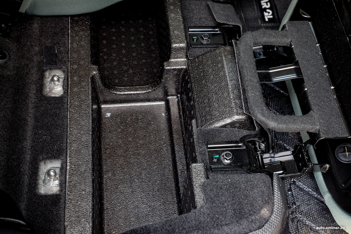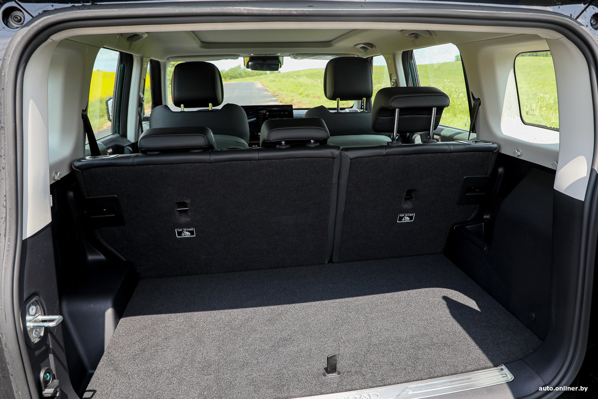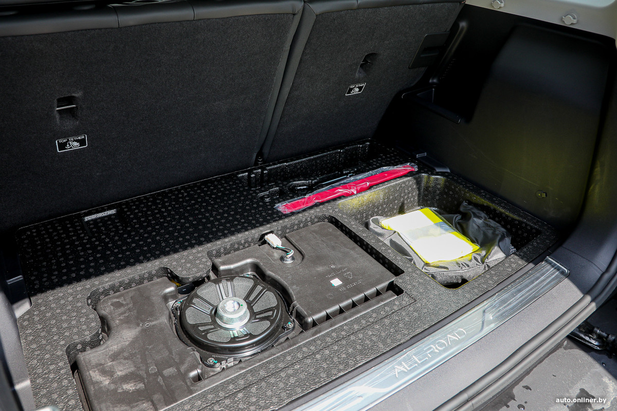 И само багажное отделение, если честно, не самых больших размеров, причем в подполье обнаруживаются лишь сабвуфер да шинный ремкомплект. Из плюсов отметим хороший проем и пол вровень с порогом, а еще то, что при складывании спинки дивана не образуется ступенька. Бонусы: крючки на боковинах, ниши для мелочовки, карман на двери. Но полки по доброй китайской традиции нет.