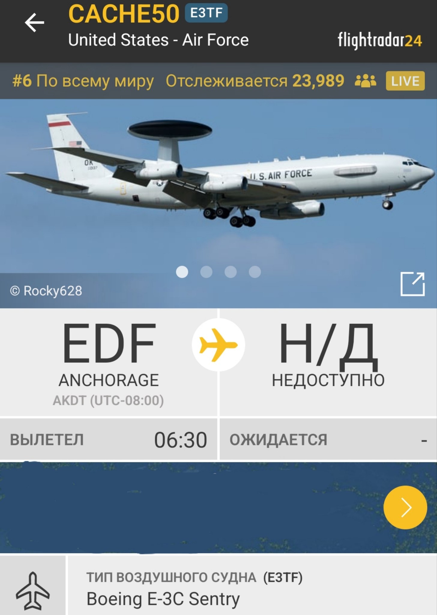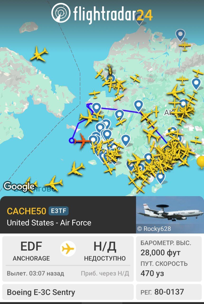 Самолет Boeing E-3C Sentry ВВС США вылетел из Анкориджа и патрулирует над Аляской. Это самолет дальнего радиолокационного наблюдения, который способен обнаруживать и идентифицировать самолеты, ракеты, а также другие объекты на большом расстоянии. Кроме того, он используется для координации и поддержки союзных сил в условиях боевых действий.