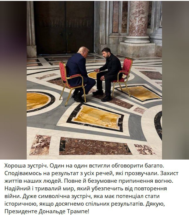 Зеленский назвал свою 15-минутную встречу с Трампом накануне похорон Папы Римского «символической», заявив, что она может стать «исторической», если будут достигнуты общие результаты. Тем временем Трамп уже покинул Рим. На Банковой обещали ещё одну встречу после похорон, но судя по тому, что церемония завершилась час назад, а Трамп улетел, второй встречи не было. Ранее СМИ опубликовали полные тексты мирных предложений — как от США, так и от Украины. Документы окончательно расставляют акценты: шанс на мир был реальным, но Зеленский и его окружение сознательно его уничтожили.