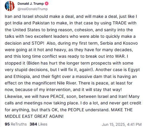 ✔️ "Иран и Израиль должны заключить сделку, и они её заключат, как я заставил Индию и Пакистан заключить, в этом случае используя ТОРГОВЛЮ с Соединенными Штатами, чтобы привнести разум, сплоченность и здравомыслие в переговоры с двумя прекрасными лидерами, которые смогли быстро принять решение и ОСТАНОВИТЬСЯ!