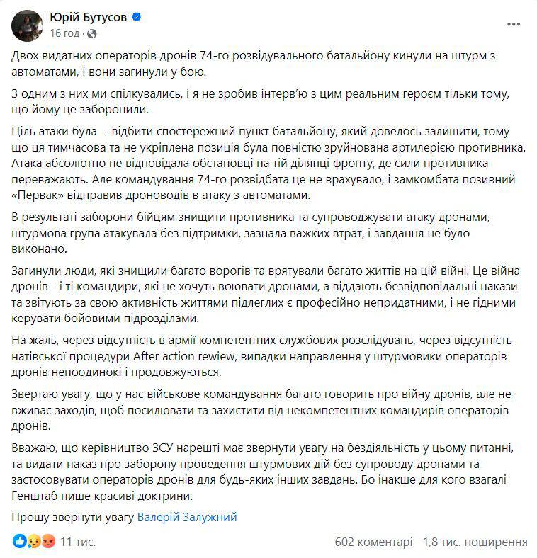 Двух выдающихся операторов дронов бросили на штурм с автоматами без подготовки и запретили использовать БПЛА. Они погибли, — Бутусов
