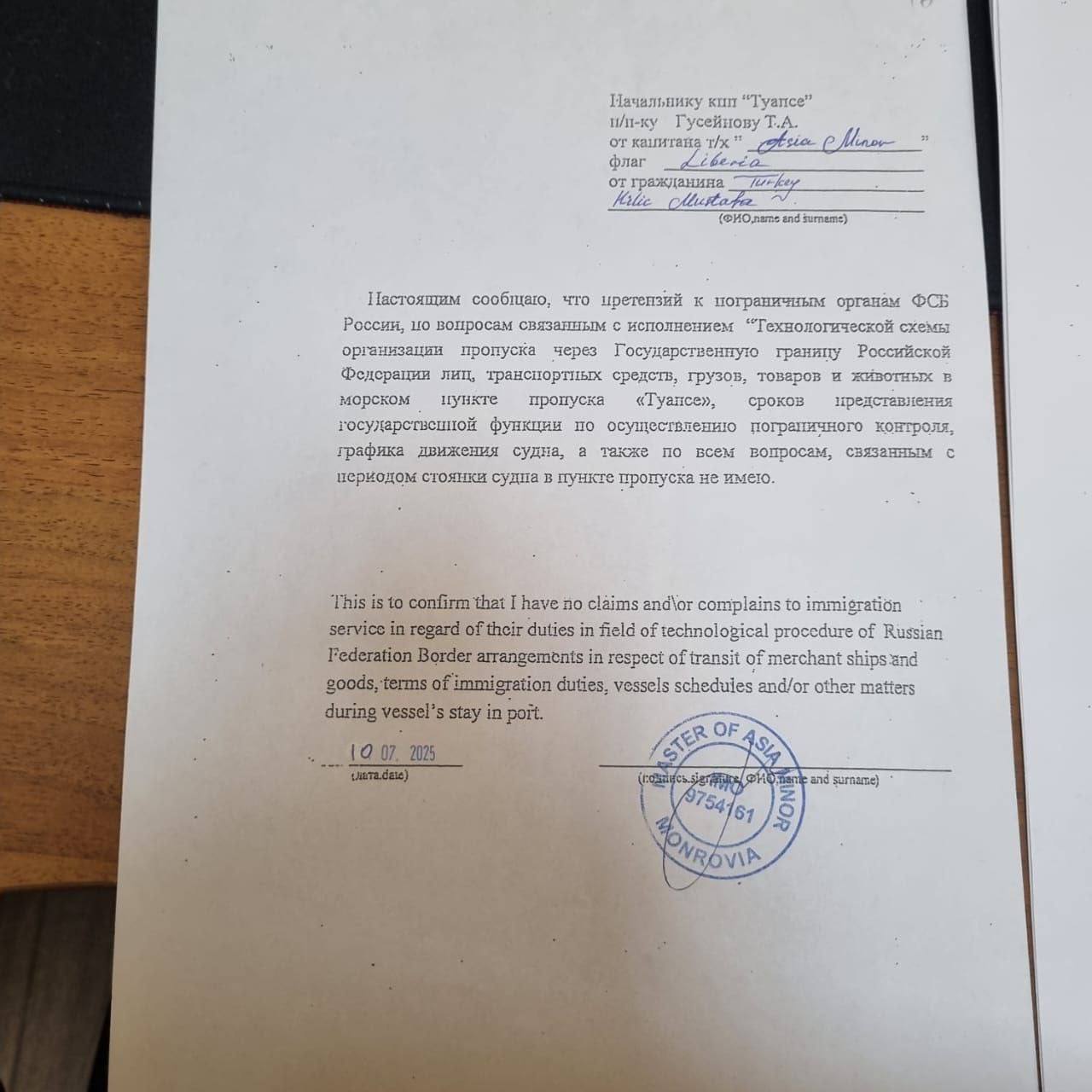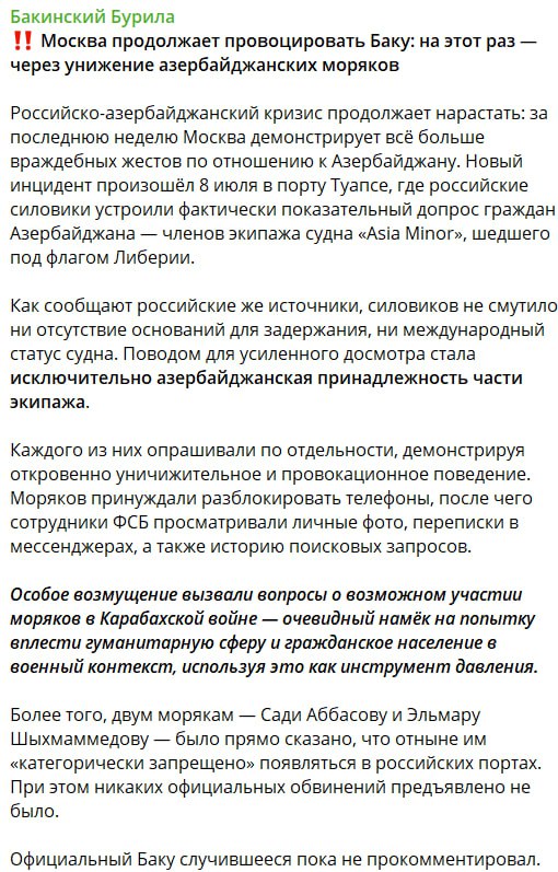 ΠΠΎ Π²Π΅ΡΡΠΈΠΈ Π±Π°ΠΊΠΈΠ½ΡΠΊΠΈΡ ΠΏΡΠΎΠΏΠ°Π³Π°Π½Π΄ΠΈΡΡΠΎΠ², 8 ΠΈΡΠ»Ρ 2025 Π³ΠΎΠ΄Π° Π² ΠΏΠΎΡΡ Π’ΡΠ°ΠΏΡΠ΅ Π·Π°ΡΠ»ΠΎ ΡΡΠ΄Π½ΠΎ Β«Asia MinorΒ» ΠΏΠΎΠ΄ ΡΠ»Π°Π³ΠΎΠΌ ΠΠΈΠ±Π΅ΡΠΈΠΈ, Π½ΠΎ Ρ ΡΠΊΠΈΠΏΠ°ΠΆΠ΅ΠΌ ΠΈΠ· Π³ΡΠ°ΠΆΠ΄Π°Π½ ΠΠ·Π΅ΡΠ±Π°ΠΉΠ΄ΠΆΠ°Π½Π°. ΠΡΠ½ΠΈΡΠ΅ΡΠΊΠ°Ρ ΠΏΡΠΈΠ½Π°Π΄Π»Π΅ΠΆΠ½ΠΎΡΡΠΈ ΡΠ»Π΅Π½ΠΎΠ² ΡΠΊΠΈΠΏΠ°ΠΆΠ° ΡΠΊΠΎΠ±Ρ ΡΡΠ°Π»Π° ΠΏΠΎΠ²ΠΎΠ΄ΠΎΠΌ Π΄Π»Ρ ΡΡΠΈΠ»Π΅Π½Π½ΠΎΠ³ΠΎ Π΄ΠΎΡΠΌΠΎΡΡΠ° ΡΠΎ ΡΡΠΎΡΠΎΠ½Ρ ΡΠΎΡΡΡΠ΄Π½ΠΈΠΊΠΎΠ² Π€Π‘Π.