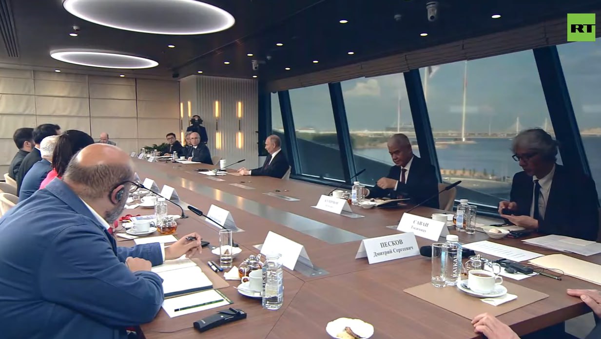 Путин начал встречу с главами зарубежных информагентств в Лахта Центре в Петербурге.