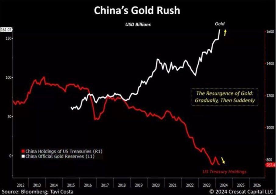 С 2018 года Китай начал избавляться от американских долговых бумаг так же резво, как стал наращивать свой золотой резерв. К 2024 году процесс ускорился максимально - Bloomberg