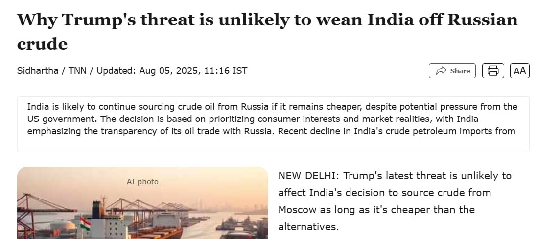 Индии нет смысла переплачивать за американское топливо при уже налаженных связях с РФ. При этом у государства действительно есть шансы договориться на скидку на фоне тарифных санкций – сделка в любом случае будет выгодна обеим сторонам.