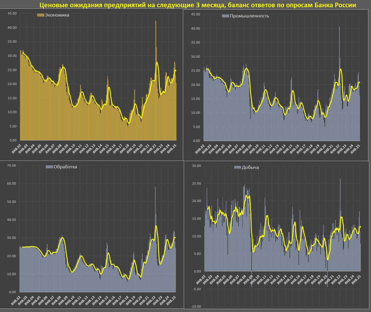 Маловероятно, что в режиме санкций, структурных дисбалансов и ресурсных ограничений индекс ценовых ожиданий вернется к средним показателям 2017-2019 на уровне 8.7 пунктов, но, вероятно, зона 16-18 пунктов может считаться «условно достойной» для снятия инфляционного выброса с повестки актуальных проблем. Для сравнения, на пике в ноя.24 было почти 28 пунктов.