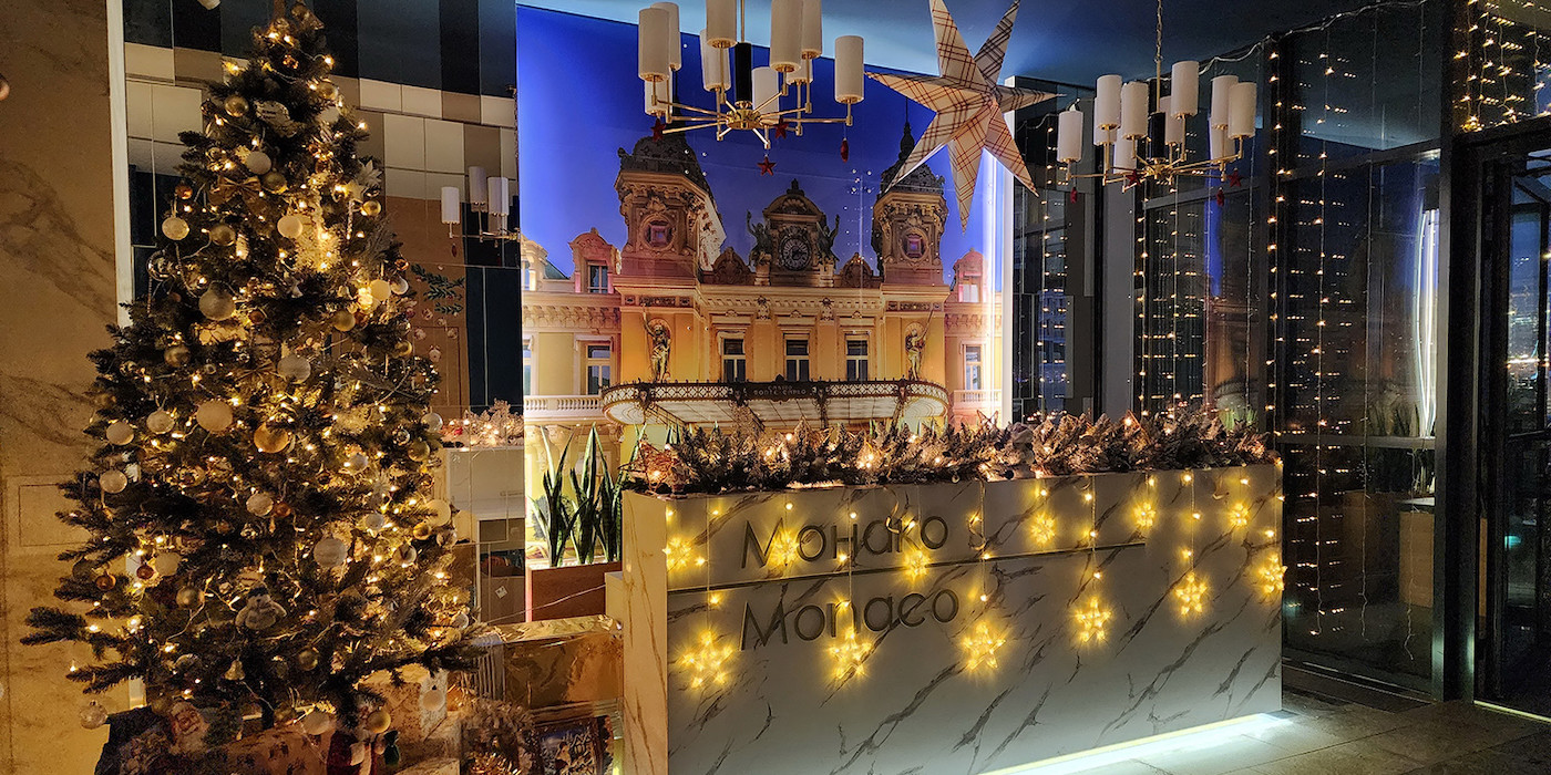 Поскольку в княжестве Монако более 300 солнечных дней в году, стилистика оформления выбрана соответствующая — на фоне стен цвета синего моря сочетание золотого, серебра и изысканного белого.