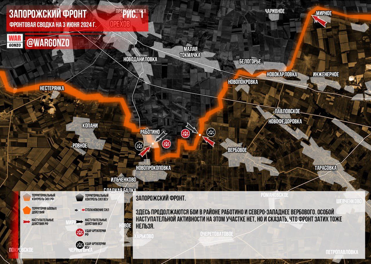 Запорожский фронт. Здесь продолжаются бои в районе Работино и северо-западнее Вербового. Особой наступательной активности на этом участке нет, но и сказать, что фронт затих тоже нельзя.(Рис. 1)