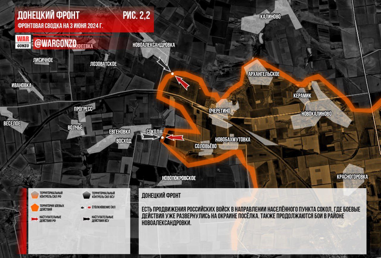 Донецкий фронт. В Парасковиевке идёт зачистка западных окраин населённого пункта. В Красногоровке российские войска продолжают расширять зону своего контроля с восточной стороны города, также продолжаются продвижение ВС РФ в центральной части этого населённого пункта. Продолжаются бои на подступах к Карловке и Яснобродовке. Есть продвижения российских войск в направлении населённого пункта Сокол, где боевые действия уже развернулись на окраине посёлка. Также продолжаются бои в районе Новоалександровки. (Рис. 2)